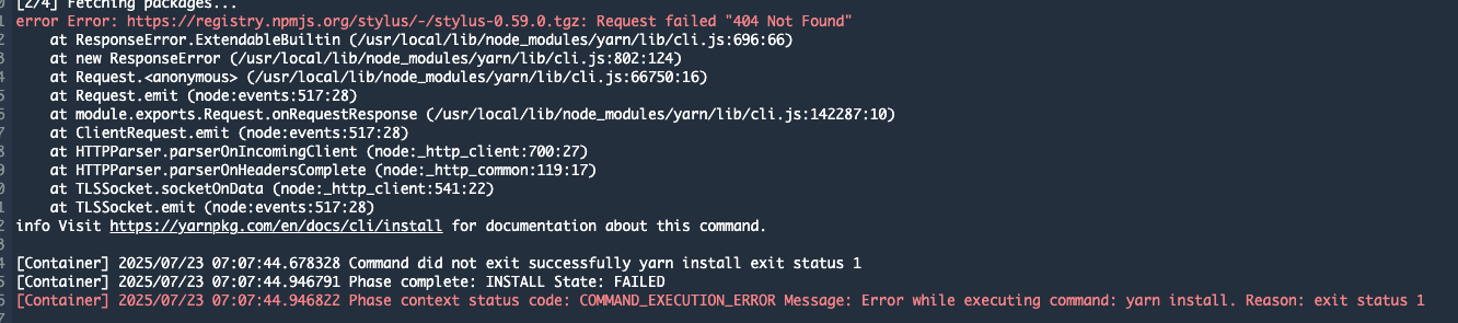 내부 소스에서 갑자기 오늘 오후부터 amplify와 code build에서 모두 빌드 이슈가 나면서 배포에 실패했습니다. 사유는 npmjs의 stylus 패키지가 존재하지 않아서 fetch 에러가 발생합니다..