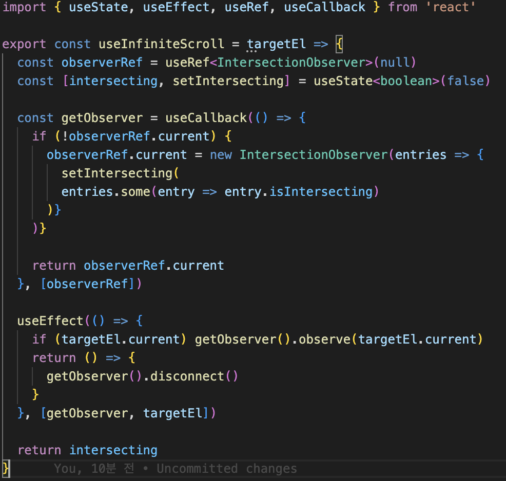 import { useState, useEffect } from "react" export const useInfiniteScroll = targetEl => { const [intersecting, setIntersecting] = useState<boolean>(false) const observer = new IntersectionObserver(entries => setIntersecting( entries.some(entry => entry.isIntersecting) )) useEffect(()=>{ if (targetEl.current) observer.observe(targetEl.current) return () => { observer.disconnect() } }, [targetEl.current]) return intersecting }먼저, 특정 부분 도달시에 useInfiniteScroll 훅에 useRef target 요소를 인자로 넘겨서 호출을 해주면 IntersectionObserver 객체를 생성하고 observe() 메서드 호출로 요소를 관찰하고 있다가 setState를 시키고, 타겟 불리언 값을 저장해놓기 위해 선언해두었던 intersecting을 리턴해준다. 이때 useEffect가 언마운트 될 때는 cleanup을 통해 disconnect를 하여 관찰을 중지한다.