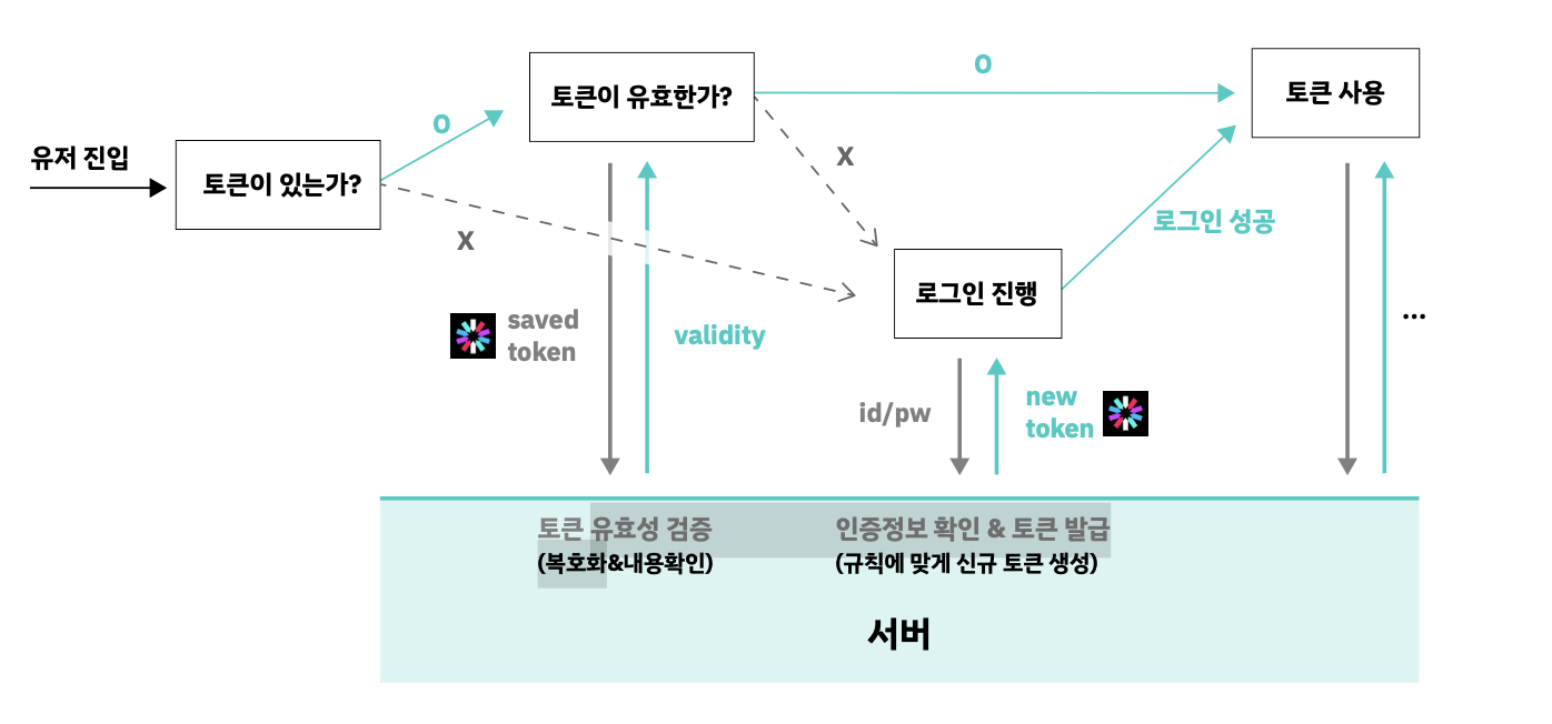 => 위 그림과 같이, 유저가 진입하자마자 저장된 토큰을 확인하는 로직을 통해서 바로 유효성 검증을 한다면 인증과정 4~5번에 해당한다.