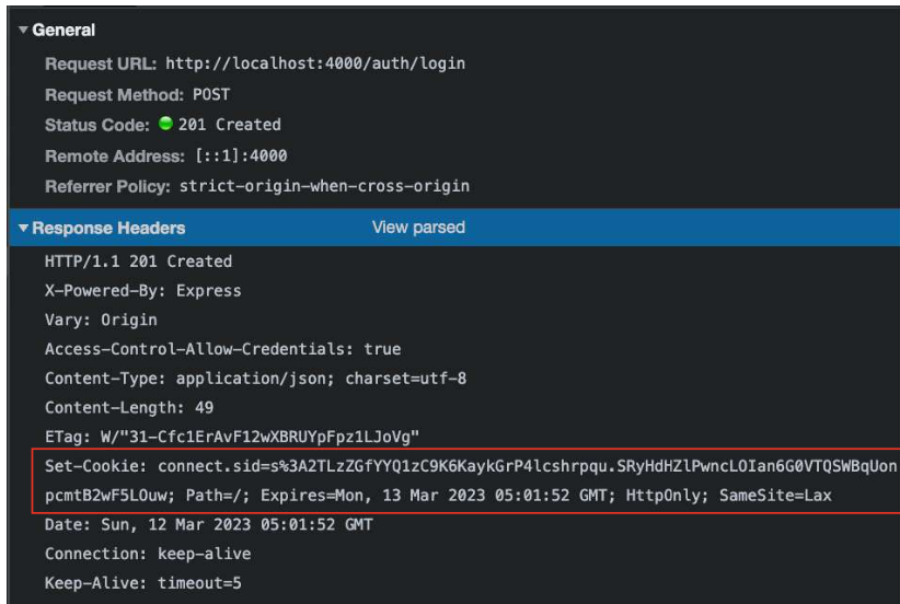 서버는 클라이언트의 로그인 요청을 통해서 인증 정보 유효성을 확인하고 식별하면 '세션 ID' 를 헤더의 set-cookie에 key-value 값으로 넣어 전달한다.
