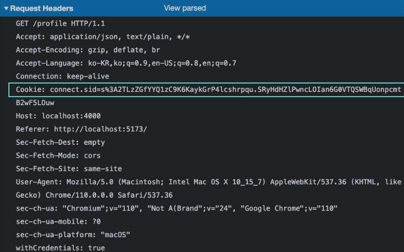 // fetch의 경우 header에 credentials: 'include' 값을 전달한다.